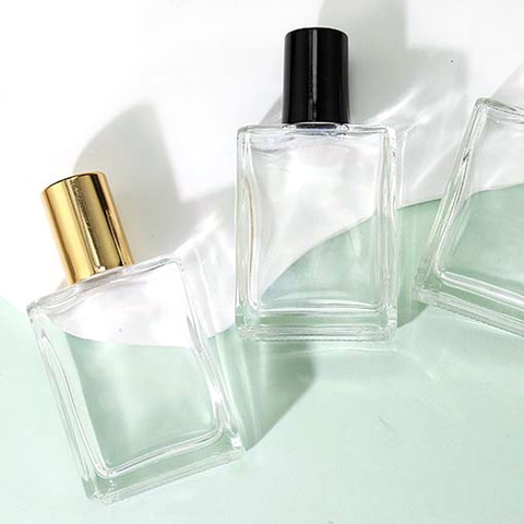 Bottiglia di profumo di vetro quadrata di lusso della silice di 30ml 50ml 100ml con l'atomizzatore portatile di colonia dell'applicatore dello spruzzo (trasparente e nero)